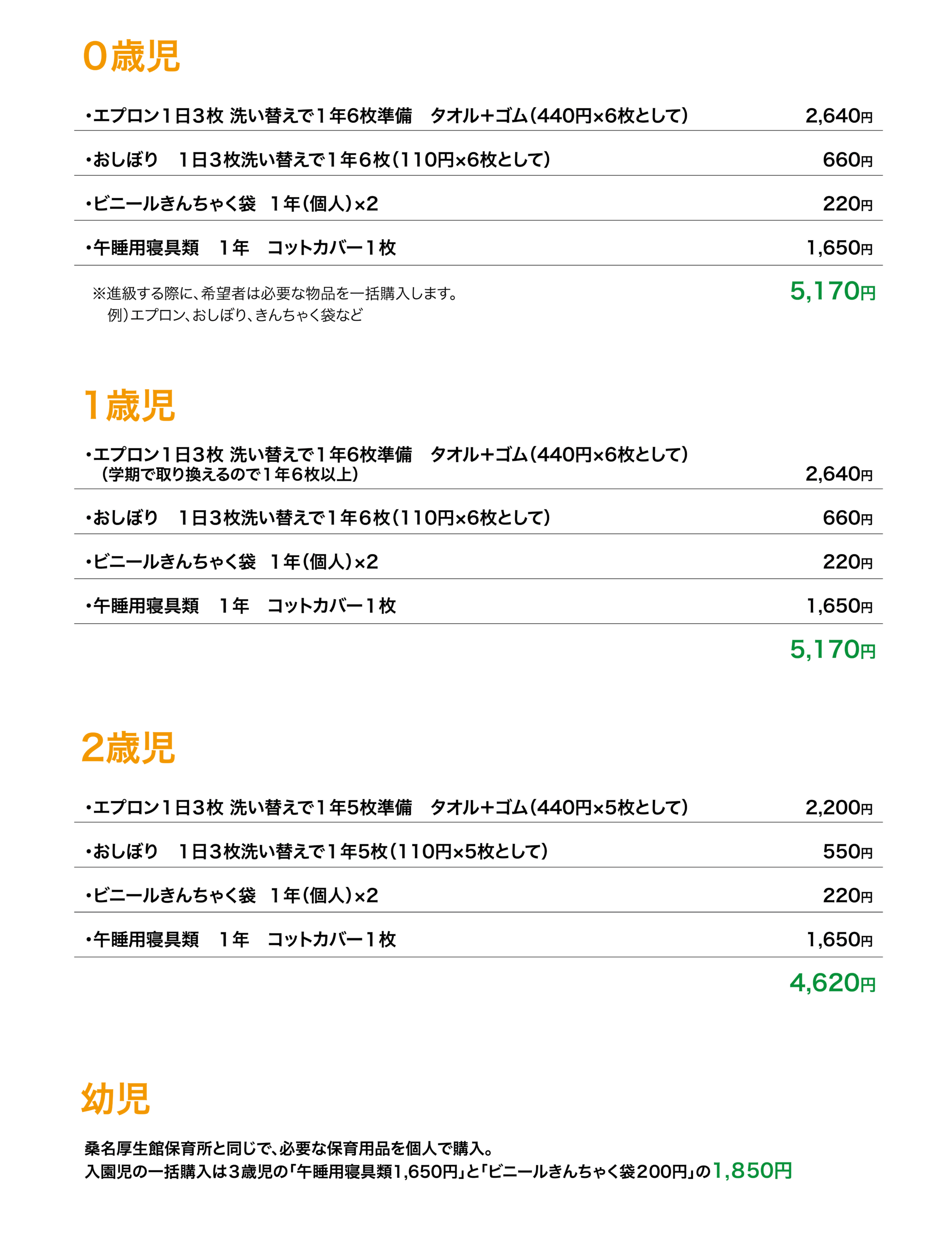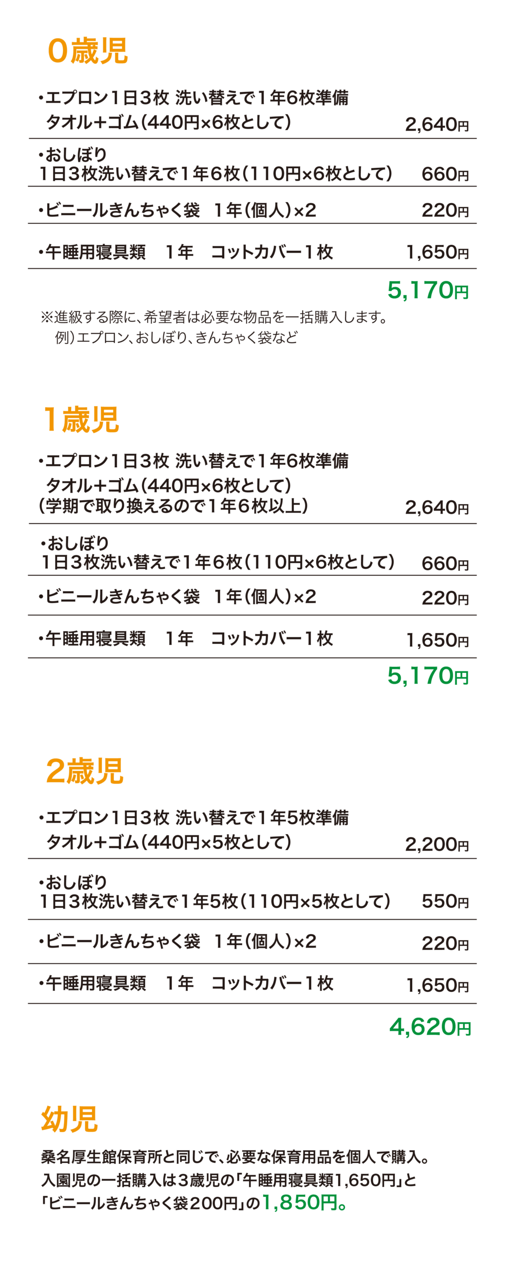 <入園時に個人が使用する日用品と保育に必要な物品の一括購入費>